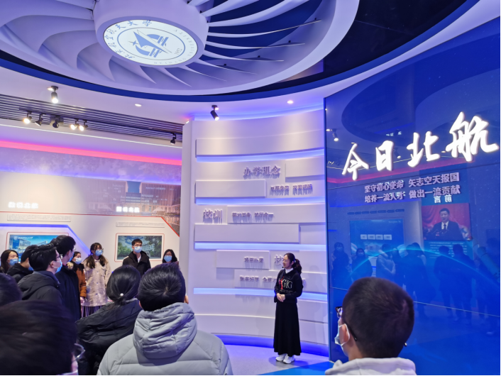 12月16日下午,304am永利集团官网BY1903班组织了以“今日北航”为主题的党团共建活动,旨在让班级同学了解北航历史,关注北航发展,进而增强同学们潜心科研、空天报国的决心。下午三时许,班长陈炼在航空航天博物馆门前组织本班同学做健康登记后,由馆内工作人员带领进入二楼“今日北航”展区。在当前国内新冠疫情好转的情况下,我们依旧没有放松警惕,整个参观过程均佩戴医用口罩以遏制流行病的传播途径。