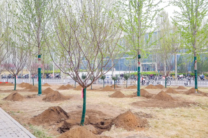 植树现场,劳动场面繁忙有序,大家挖坑、立苗、填土、浇水,合力栽下30株优质树苗,包括红枫、红梅、高杆月季等树种,为沙河校园新添一片观赏区域。