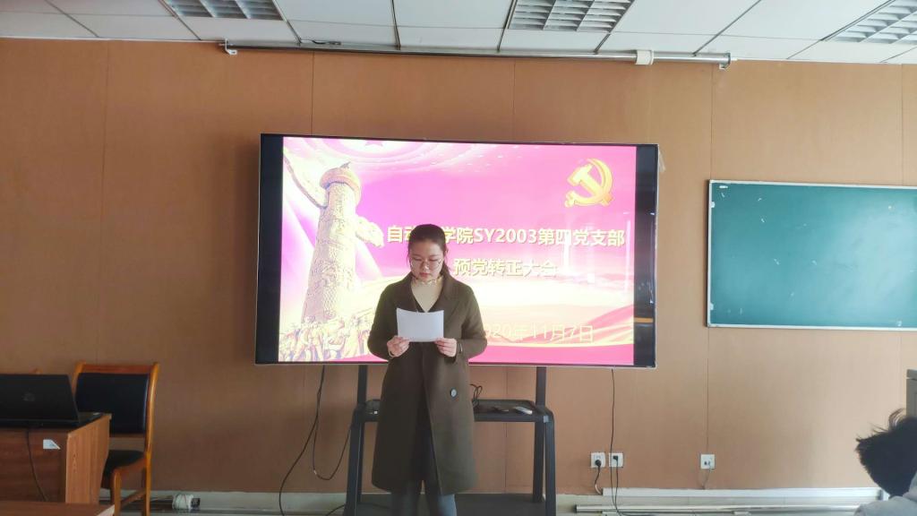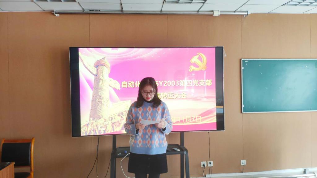 2020年11月4日下午,304am永利集团官网SY2003第四党支部预备党员转正大会顺利在E706教室召开,大会由支部书记姜琳琳同志主持。本支部共有正式党员12人,预备党员5人,今日有一人因病因事请假,共到场16人。此次大会讨论转正的同志分别是沈炜同志和邴璐同志,她们经过党组织为期一年的培养考察,已经达到转正的标准。