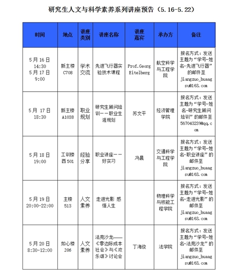 为提升我校研究生文化素养,培养研究生科学精神,促进研究生学术交流,营造具有传统与时代结合、人文与科学融合的研究生创新文化,党委研究生工作部于2016年3月启动我校研究生人文与科学素养提升平台建设。每周在校园网和研究生院官网上对近期即将举行的人文与科学素养讲座、报告或相关活动进行预告,欢迎感兴趣的同学积极参与。